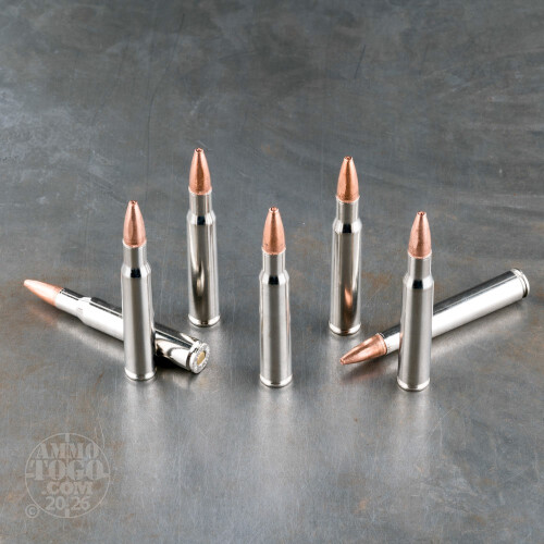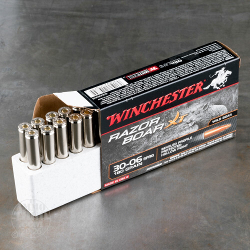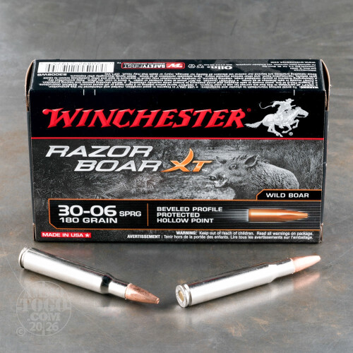 This is 30-06 Winchester Razorback 180gr. Beveled Profile Protected Hollow Point Ammo. Razorback XT ammunition is designed specifically for the rugged demands of boar hunting. It drives through thick hide and bone to deliver lethal impact on the toughest wild boars. Engineered hollow point is optimized for delayed expansion through heavy hide. Winchester loaded these rounds with a low flash powder that reduces muzzle flash, preventing night blindness. Lead-free bullet offers maximum weight retention and strength. This ammo is brass cased - nickel coated, boxer primed, non-magnetic, and non-corrosive. It comes packed in 20rd. boxes. Muzzle Velocity: 2700 fps.