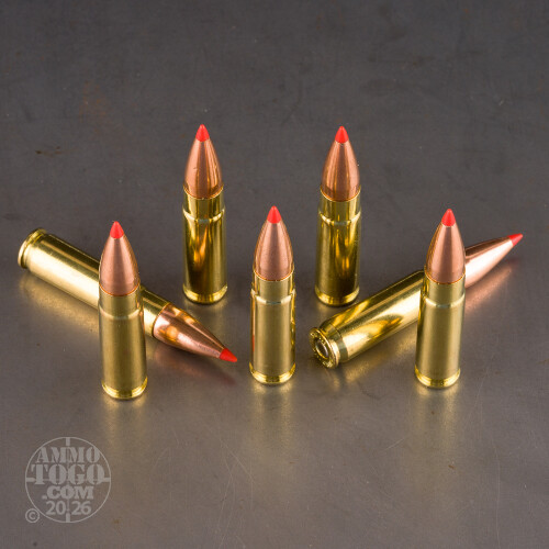 “Max” seems to be the name of about 40 percent of the German Shepherds on planet Earth. But there is only one V-MAX, and it is precisely the bullet you want if you plan on plastering varmints with your 300 AAC Blackout rifle!Ammo Inc. loads this cartridge with Hornady’s 110 grain V-MAX. It is a polymer tipped bullet which boasts exceptional ballistic efficiency courtesy of its highly concentric AMP jacket, uniformly balanced swaged lead core and aerodynamic profile. This round’s V-MAX has a flat base, which promotes accuracy by giving propellant gasses an extremely even surface to push up against.