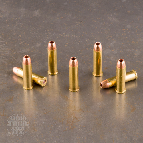 Leaving the muzzle at a velocity of 1235 feet per second, each round delivers 423 foot pounds of muzzle energy. Packed in 20-round boxes with 200 rounds per case, this ammunition is non-corrosive, boxer primed, and brass cased.