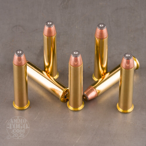 This handy cartridge will knock down any medium game critter you could rest your rifle’s sights on. The 300 grain soft point bullet features a hard copper jacket and flat nose profile that ensure smooth operation in any lever-action long gun. Good for revolvers, too! The SP delivers a reasonably flat trajectory (1,850 fps muzzle velocity out of a 24” test barrel; 0.289 G1 ballistic coefficient), and terminates its flight by dishing out quick and lethal terminal expansion.