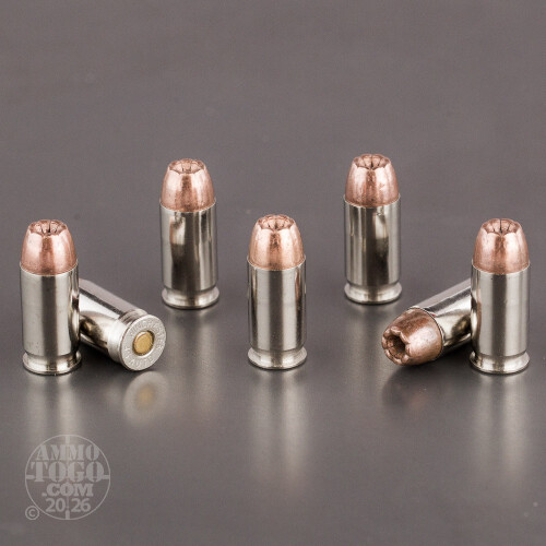 Why even carry a pistol if you’re any less than 100 percent certain that its ammo can keep you safe when you most need it? This 45 ACP round from Winchester’s Defender line of ammunition has a 230 grain PDX1 projectile, the core and jacket of which have been welded together via its manufacturer’s own proprietary bonding process, so it will separate as little as possible as it busts through common urban barriers and penetrates deeply within a threat. The bullet’s hollow point consistently expands up to 1.5 times its original diameter to improve its chance of making mincemeat of vital organs, and the notches in its tip preprograms it to reliably spread out along six predetermined axes. Try this round out for yourself on some ballistic gel and see why its performance won the business of the FBI!The best bullet in the world is still just a bullet without the right components to complement its performance. This round won’t fail you for having corroded, as its brass casing wears shiny nickel plating. The lubricious casing further guarantees smooth feeding and ejection, so you’ll not be left hanging by a jam during a fight. Winchester’s non-corrosive primer and clean burning propellant will let you train with this case of ammo without having to take pause for a cleaning!