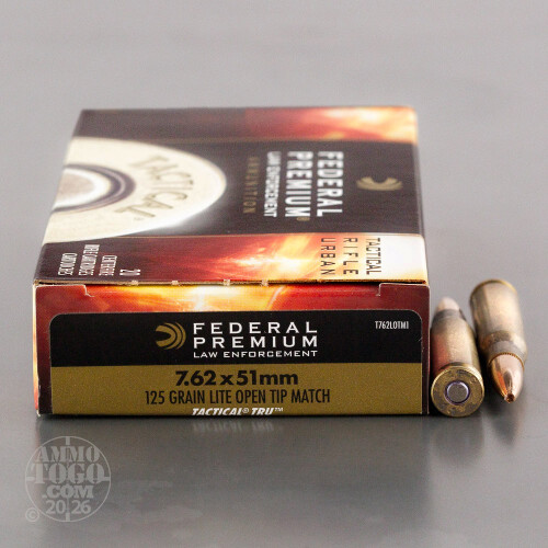 This 200 round bulk case of 7.62x51mm cartridges is great for precision match use with your bolt-gun or for self-defense magazines to be run through your battle rifle! Federal manufactures the Tactical Rifle Urban (TRU) line with law enforcement applications in mind and designs these rounds for devastating terminal effect that won't cause collateral damage in domestic environments. As a result, these rounds utilize 125 grain open-tip match (OTM) projectiles which fragment immediately on target; the OTM concept is intended to yield jaw-dropping accuracy with long-range rifles but has also been proven effective in recent wartime theaters.