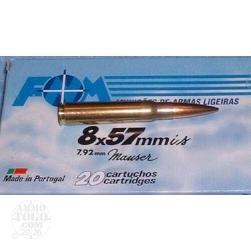 This is 8mm Mauser 196gr. FMJ ammo. This ammo is manufactued by FNM to military and CIP spec's. It is brass cased, non-corrosive and boxer primed, which makes it 100% reloadable. This is some excellent ammunition and is safe to shoot in all 8mm Mauser weapons.-