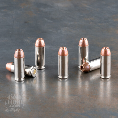 You carry a beefy 10mm pistol because you want to be certain that you’ve got the firepower ready to neutralize most any threat that could fall in your way. Get a round that can truly serve that purpose -- the Winchester Defender 10mm. Its 180 grain projectile’s jacket and core are bonded together via Winchester’s unique welding process, so they’ll stay as one even for having passed through tough barriers en route to the target. The bullet’s jacket is strategically notched, enabling it to reliably expand up to 1.5 times its original diameter, taking on the shape of a six pointed star as it does so. With its supersonic muzzle velocity, this bullet will have tremendous energy to disperse wherever it winds up.This round’s bullet isn’t its only reliable component. Its brass casing is nickel plated, so you can count on it to better shrug off atmospheric moisture until the time comes for it to do its job. It also cycles more smoothly owing to its jacket, and its added sheen makes it easier to check your chamber when you’re in dim lighting. Round it off with a non-corrosive primer and expertly loaded propellant charge, and you’ve got a personal protection load that you can chamber with the utmost confidence.