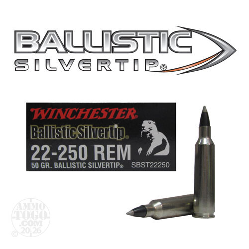 This is .22-250 Rem Winchester Supreme 50gr. Ballistic Silvertip Ammo. The Winchester Supreme Ballistic Silvertip's solid based boat tail design delivers excellent long range accuracy. In medium to larger calibers, the special jacket contours extend the range and reduce cross-wind drift. The harder lead core ensures proper bullet expansion. This ammo comes packed in 20rds. per box.