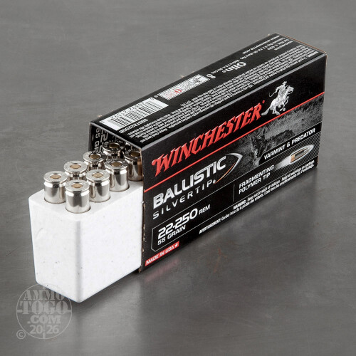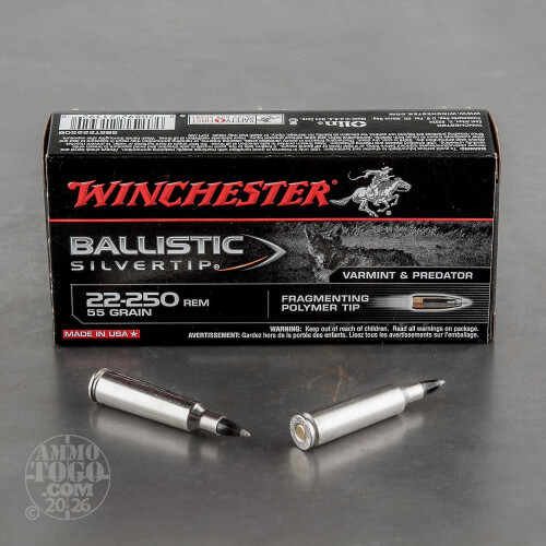 This is .22-250 Rem Winchester Supreme 55 grain Ballistic Silvertip Ammo. The Winchester Supreme Ballistic Silvertip's solid based boat tail design delivers excellent long range accuracy. In medium to larger calibers, the special jacket contours extend the range and reduce cross-wind drift. The harder lead core ensures proper bullet expansion. This ammo is ideal for dealing with any size varmint that you might have on your property. This ammo comes packed in 20 round boxes.