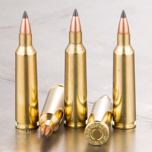 Each factory fresh .22-250 Remington cartridge features a 55 grain polymer-tipped hollow point projectile. These proprietary bullets deliver an increased ballistic coefficient to maximize long-range accuracy. Each bullet is engineered with a thin alloy jacket with a special sidewall profile. This jacket surrounds a softer lead core and produces rapid and explosive fragmentation as the polymer tip is driven into the hollow point upon target impact.