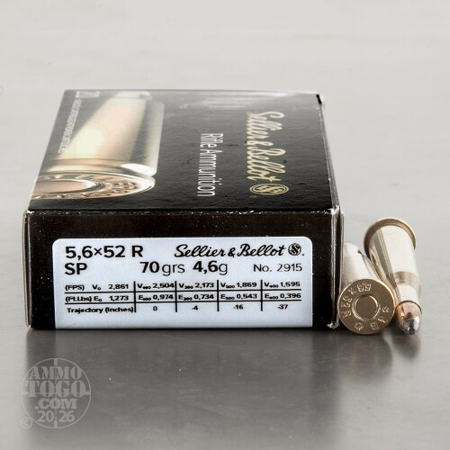 This 22 Savage Hi-Power cartridge (which is also known in Europe as the 5.6x52mmR) sports a 70 grain projectile. The bullet’s jacket contains CuZn 10, a strong alloy which enables it to penetrate the toughest hide without issue. This bullet’s soft point causes it to mushroom to far greater than its original diameter during penetration, making it positively devastating and suitable for all kinds of hunting. The 22 Savage Hi-Power has been utilized in the past to take tiger, Cape buffalo, and even elephant -- should you encounter a tiger while you have this round chambered, you’ll have the perfect opportunity to finally acquire that rug you’ve been waiting on to tie your living room together.As of last decade, American shooters couldn’t buy a locally made 22 Savage Hi-Power. Czech manufacturer Sellier & Bellot has always stood by to provide this cartridge, however, and theirs is exceedingly good with its non-corrosive primer and corrosion resistant brass casing. This round is further packed in an oil resistant box. The effect of all of this is a round you can confidently keep in storage until a tiger strolls through your backyard.