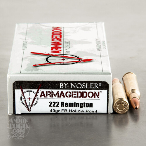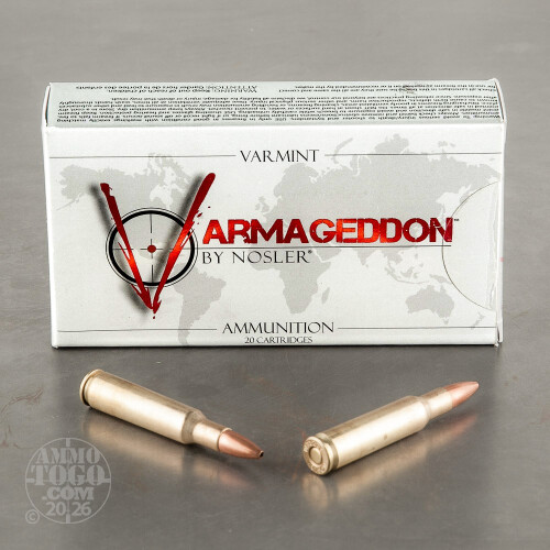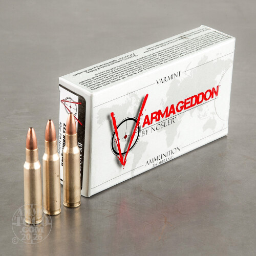 Nosler’s Varmageddon brand is aptly named -- this is the ammo you use to rid your property of things that dig holes for cows to trip in and skulk around hen houses at night. It’s also priced affordably, however, so you can comfortably enjoy a Varmageddon round for good old-fashioned target shooting as well.This 222 Rem cartridge is crowned by a flat base hollow point projectile. Its nose cavity is optimized both for straight flight and devastating terminal effect, and its jacket’s thin mouth facilitates rapid expansion at virtually any velocity. This bullet isn’t only fast thanks to its mach three muzzle velocity -- its uniformly distributed core, concentric jacket, and precision formed flat base all do their part to give it exceptional stability in flight. Nosler employs superb brass and primers when they create their ammo, so you can count on this round to take care of whatever kind of business you’re out to get done.