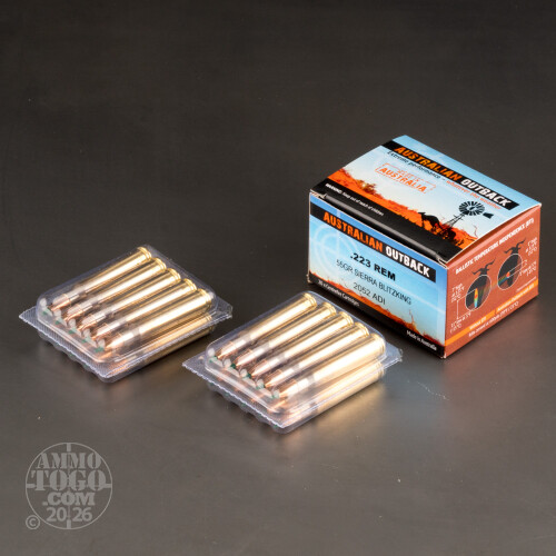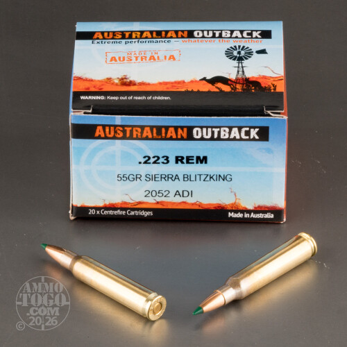 This is .223 Australian Outback 55gr. Sierra BlitzKing Polymer Tip Ammo. The only ammunition with Ballistic Temperature Independence (BTI) technology. No matter if it's scorching hot or freezing cold, Australian Outback ammunition delivers consistent extreme high velocity and accuracy in all shooting conditions. Varmint hunting places extreme demands on bullet performance. Such bullets must be exceptionally accurate to hit small targets, lightly constructed to provide explosive expansion while minimizing ricochets, and lightweight to obtain high velocities with flat trajectories. Sierra BlitzKing bullets are the standard against which other brands are measured. This ammo is brass cased, boxer primed, non-magnetic and non-corrosive. This ammo comes packed in 20rd. boxes.