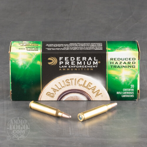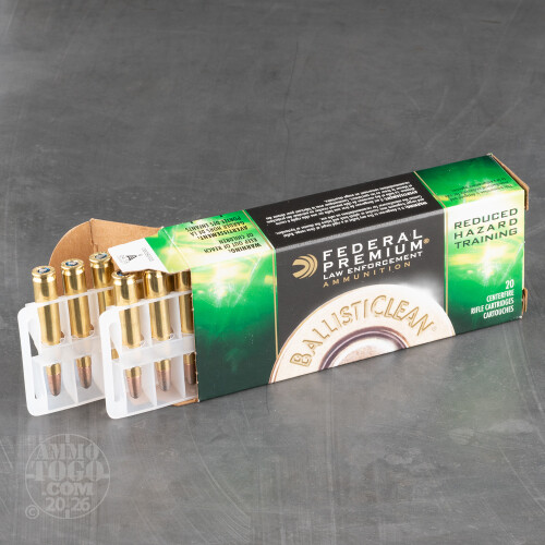 Engineered to provide law enforcement personnel with a safe and affordable practice round, Federal LE Ballisticlean is premium training ammunition. Each factory fresh .223 Remington cartridge is loaded with a 55 grain Reduced Hazard Training (RHT) frangible projectile. These non-toxic, lead-free bullets break apart upon impact with a metal target, significantly reducing the risk of dangerous ricochet and backsplash. Leaving the muzzle at a velocity of 3100 feet per second, each round generates a muzzle energy of 1174 foot pounds.