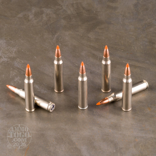 Use one of these 223 Rem cartridges on a coyote and it’ll wish it had stuck to trying to catch roadrunners with giant magnets and rocket skates. This round features a 40 grain Ballistic Tip projectile by Nosler. It’s a highly accurate projectile with a boat tail and exceptionally concentric jacket, so you’ll be able to hit the coyote even if it’s currently using its rocket skates. This bullet also features a polymer tip that is color coded to its caliber, which helps to prevent magazine deformation as well as initiate devastating expansion upon impact. The Ballistic Tip’s thin jacket is tapered to control that expansion, and its sturdy lead alloy core ensures deep penetration. Thanks to its heavy jacketed base the Ballistic Tip’s expansion has a solid platform to take place on!These rounds have intensely uniform casings to ensure smooth feeding and extraction as well as consistent performance. Federal’s primer and propellant are top notch, so nothing in the Acme catalog will get the coyote out of the trouble he’ll be in when you find him.
