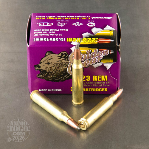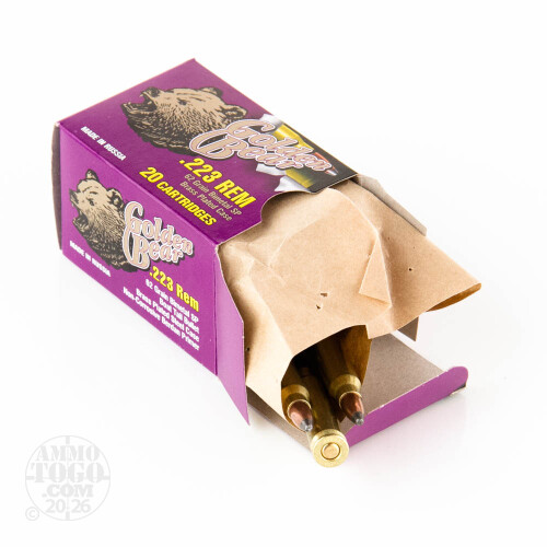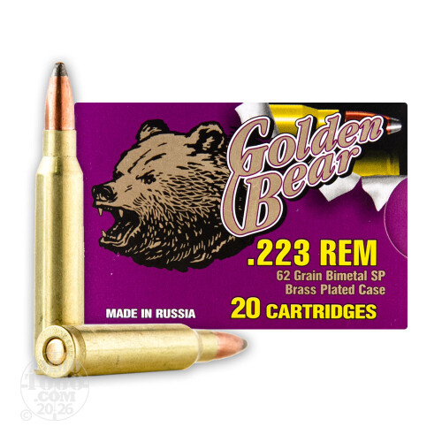 This package contains 20 rounds of Golden Bear .223 Remington ammunition. Each cartridge is loaded with a 62 grain soft point projectile. Providing excellent terminal expansion, these soft point bullets are perfect for hunting small to medium game, predators, and varmints, although it is also suitable for target shooting.