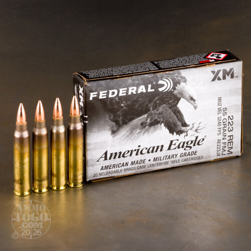 American Eagle. It doesn’t always mean chichi flannel shirts and jean jackets for college freshmen. When it’s made by Federal, it’s proper good range ammo for your firearm of choice. And if that happens to be an AR-15, then we believe this 223 Rem ammo (which is also suitable for 5.56 rifles) will put a big old grin on your face.This cartridge has been decked out with a 55 grain FMJBT bullet. It’s really the most popular kind of 223 bullet because it’s so simple, just a lead core with a copper alloy jacket that together are nonmagnetic and accurate enough for rewarding target shooting. The bullet’s narrowing base makes it more ballistically efficient, and thus promotes the velocity retention you want for a flatter trajectory during long-distance shooting.