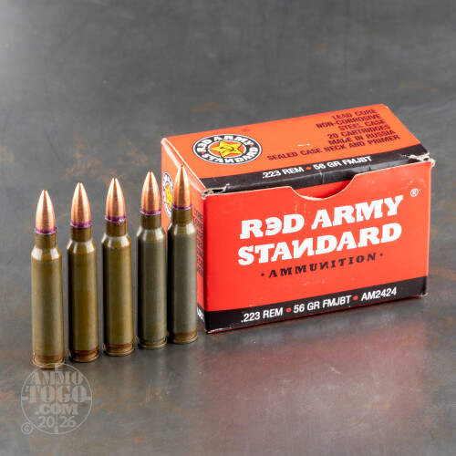 Red Army Standard ammunition is provided by Century International Arms, a firearms manufacturer which like so many others was founded by a typewriter repairman in Vermont back in the 60s -- he had placed an ad for an old Lee-Enfield in the classifieds, saw that selling rifles was better money than fixing typewriters, and changed his line of work accordingly. CIA is based out of Boca Raton now, a place that has far nicer weather than Vermont which is enveloped in ice for half of the year.This is a cost effective 223 Rem cartridge, with a non-reloadable steel casing instead of a brass one. Its Berdan primer is non-corrosive, and it along with the casing’s neck are sealed so as to protect them from the elements. This round’s 56 grain bullet is highly accurate thanks to its boat tail design, and furthermore delivers a flat trajectory and superior momentum downrange. The bullet’s full metal jacket will protect your weapon from rapidly fouling with lead, so you can fire it longer in between cleanings without forfeiting accuracy.