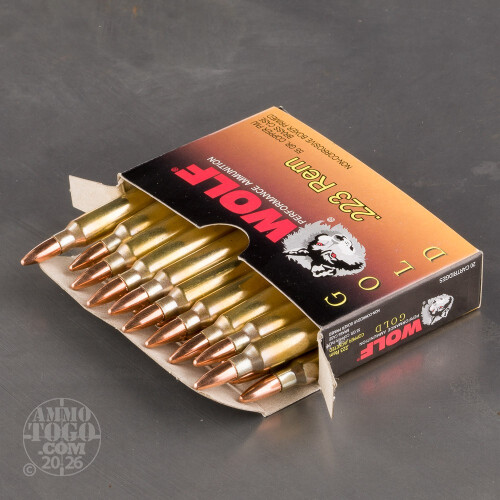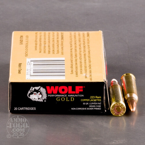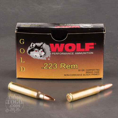 This is 223 Rem Wolf Gold 55gr. Full Metal Jacket Ammo. This load is from Wolf's top-tier Gold line. Wolf Gold line ammunition is brass cased, boxer primed, non corrosive, and is equipped with a copper jacketed non magnetic projectile. It comes packed in 20rd. boxes. Muzzle Velocity: 3250 fps.