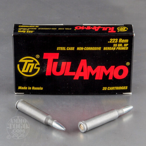 The Tula Cartridge Works is a Russian weapon manufacturer founded in 1880 by Emperor Alexander II. One of the world’s most significant producers of small-arms ammunition, Tula combines centuries of experience with cutting-edge research and technology to meet the specific needs of the modern shooter.This package contains 20 rounds of Tula .223 ammunition. Each round is loaded with a 55 grain hollow point projectile featuring a bimetal jacket and a soft lead core. This construction results in excellent ballistics characteristics. An ideal option for hunting, target practice, and backyard plinking, these rounds are rugged, reliable, and affordable.