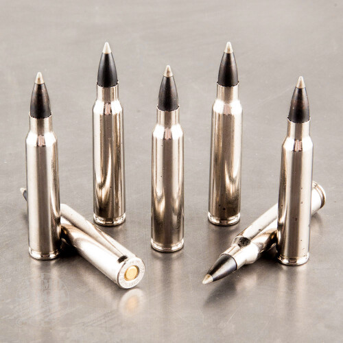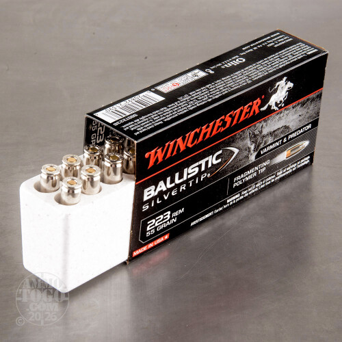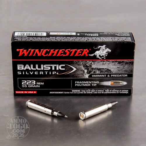 The varmints have had their fun. Now it’s time for you to have yours! Winchester Ballistic Silvertip ammo gives a 223 Rem (or 5.56x45) rifle the power to drop any small game animal that makes the grave mistake of attracting your attention!This cartridge’s 55 grain bullet is quite striking. Its pearl-colored polymer tip prevents the bullet from becoming deformed in the magazine, and also complements the boat tail to enhance ballistic efficiency. The Silvertip bullet’s ballistic coefficients are relatively high at G1 0.272 and G7 0.136. It should reach 200 yards without having to rise above the muzzle by more than 2.1”!