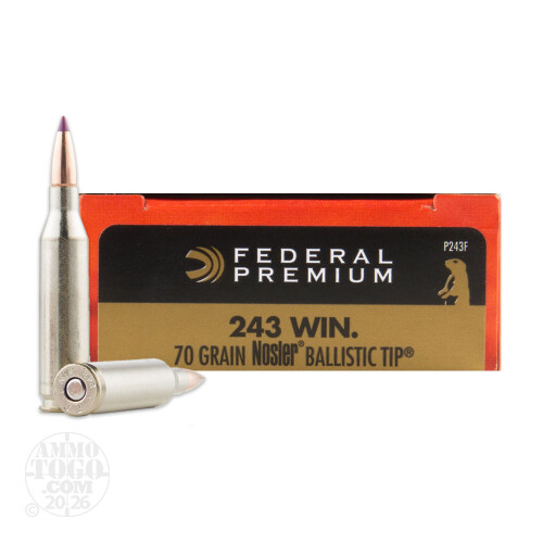 This is .243 Win. Federal Vital-Shok 70gr. Nosler Ballistic Tip Ammo. Federal Vital-Shok ammunition is designed for maximum performance and reliability. It combines hight velocities with devastating expansion to create an excellent varmint cartridge. These premium hunting bullets are matched with select powders, primers, and brass to create a reliable, hard hitting hunting cartridge. This is new production ammo, non-corrosive, in boxer primed, with reloadable brass. This ammo comes packed in 20rds. per box.
