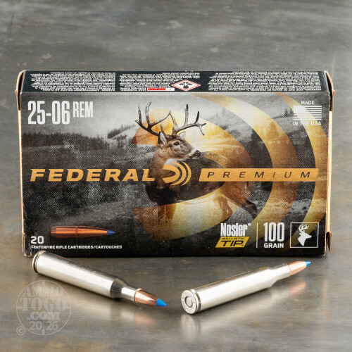 This is .25-06 Rem. Federal Vital-Shok 100gr. Nosler Ballistic Tip Ammo. Sizzling velocity and explosive expansion make Vital-Shok the ultimate choice for your favorite medium game. The Nosler Ballistic Tip is specially designed for those long-range shots. Whatever the target, varmints, predators or medium game, this fast, flat-shooting round will find its mark. The color-coded polycarbonate tip provides easy identification and prevents deformation in the magazine. Add the advantage of wind-defying performance and immediate energy transfer with this versatile bullet and you will find yourself with a new favorite ammo. This ammo comes packed in 20rds. per box.