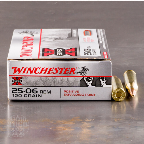 This is .25-06 Rem. Winchester 120gr. Positive Expanding Point Ammo. Super-X Positive Expanding Points are specifically designed for extreme accuracy and maximum impact on varmints and medium size game. This ammunition is new production, non-corrosive, in boxer primed, reloadable brass cases. The 120gr. Positive Expanding Point has a muzzle velocity of 2990 fps and 2382 ft. lbs. of pure energy upon impact. This ammo comes packed in 20rd boxes.