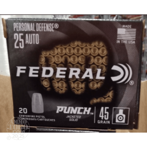 Leave a ReviewWhy Shooters and Hunters love or hate 20rds – 25 ACP Federal Punch 45gr. Jacketed Solid Ammo