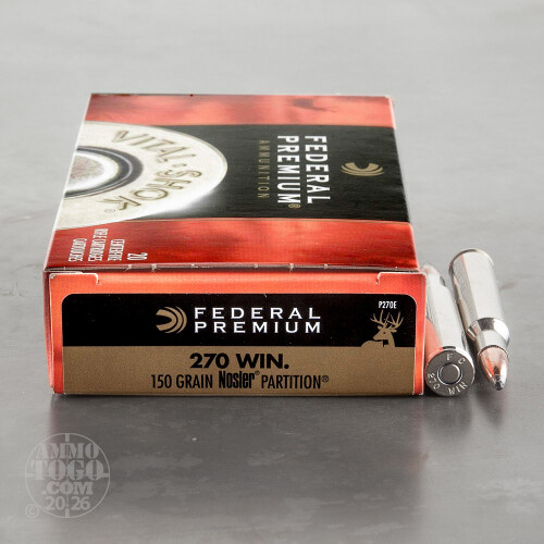 This is .270 Win. Federal 150gr. Vital-Shok Nosler Partition Ammo. Fast at 2830fps, and strong with 2667 ft-lbs, Federal Vital-Shok makes a great round. Match that with world-class brass, select powders and legendary primers and you get ammunition you can truly believe in. This ammo comes packed in 20rd. boxes.