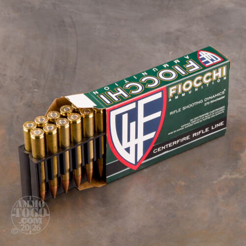 military around the world. Their expertise in crafting precision ammo shines with their special 150 grain .270 Winchester ammo. Featuring a 150 grain pointed soft point bullet, this round offers exceptional long range accuracy, while still delivering the knockdown performance of a jacketed soft point bullet. Designed for the discerning hunter or target shooter, this ammo fits an ideal middle ground, between the accuracy of ball ammo, and the lethality of a soft point bullet.Packed in handy 20 round boxes, this ammo generates a whopping 2705 foot pounds of energy while pushing it's 150 grain PSP bullet at 2850 feet per second. Brass cased and reloadable, this premium grade hunting ammo is ideal for deer and hog sized game, and gives you a serious edge in the field. The PSP bullet damages less meat, while still ensuring a clean, quick and humane kill. Imported from Italy, this is top shelf ammo in every way, except for the price. Take advantage of our bulk buying power, and stock up on Fiochhi .270 Winchester 150 grain PSP