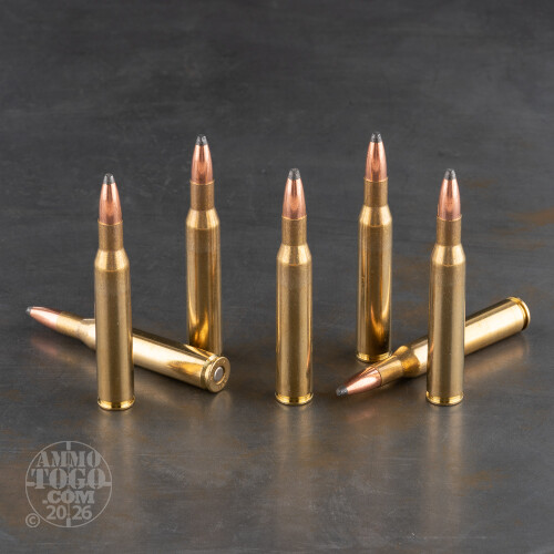 This ammunition is factory fresh, 100 percent non-corrosive, boxer primed and brass cased. Leaving the muzzle at a velocity of 3051 feet per second, each round produces a muzzle energy of 2677 foot pounds.