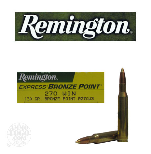 This is .270 Win Remington Express 130gr. Bronze Point Ammo. Remington Bronze Point delivers exceptional long-range performance on medium-sized game. Sleek profile generates flat trajectory. On impact, the bronze tip is driven backward to create rapid, but controlled expansion. Brass cased, boxer primed, non-magnetic, and non-corrosive. This ammo is packed in 20rd boxes.