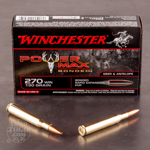 This package contains 20 rounds of Winchester Power Max Bonded .270 Win ammunition. Each cartridge is loaded with a 130 grain bonded hollow point projectile. Using a proprietary bonding process, Winchester welds a soft lead core to a copper alloy jacket, allowing both core and jacket to act in unison during expansion. The result is improved target penetration and excellent weight retention.