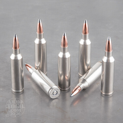 This 270 WSM (Winchester Short Magnum) cartridge is from Federal’s Vital-Shok line of ammunition, and it features Nosler’s renowned Partition projectile. The bullet’s copper alloy jacket forms a literal wall within the bullet, separating (or partitioning, if you will) its core into two discrete portions. The rear section’s job is to retain the bullet’s weight and provide a platform upon which expansion can take place; It is strengthened by special crimp locks which prevent deformation under heavy pressure. The front section is exposed at the Partition’s tip, and along with the jacket’s thin mouth and contouring causes damaging energy release and ensuing wide mushrooming during impact, even at lower velocities.This round is perfect for taking medium to large game at close to mid-range, a versatile and high quality selection for hunting. Federal’s own brass nicely accompanies so technologically advanced a bullet, and their non-corrosive primer and fast-burning propellant guarantee consistent downrange delivery.
