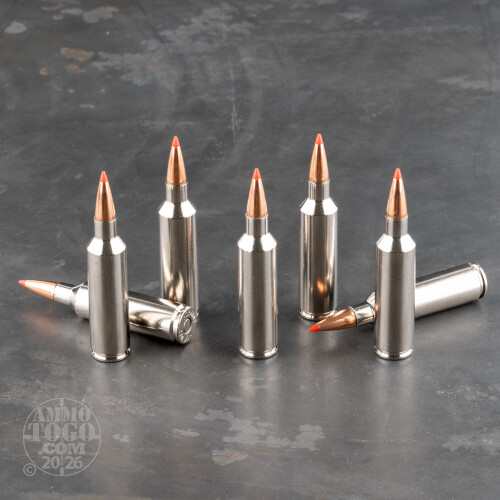 This 270 WSM round showcases Hornady’s monolithic copper alloy GMX projectile. Copper’s utility isn’t limited to its compliance with California’s ammunition laws -- it will also lessen the need for field cleanings by only barely fouling your rifle’s bore over the course of a hunt, and its solidity means it retains that no less than 95 percent of its weight during penetration to ensure a deep, devastating wound channel. The GMX’s polymer tip drives inward on impact to initiate quite a great deal of expansion, so the wound channel it creates is wide as well. No elk is beyond this 130 grain GMX’s influence.The GMX’s tip improves its ballistic coefficient, as does its sleek profile and the cannelure and pressure relieving grooves encircling its shank. Such accuracy is a good ally to have during any hunt. And if your hunt is going to take you through the ruggedest elements that the wilds have to offer, then you’ll greatly appreciate an Outfitter round’s corrosion resistant nickel plated brass casing and waterproofed mouth and primer.