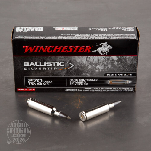 This is 270 WSM Winchester 130gr. Supreme Ballistic Silvertip Ammo. The Winchester Supreme Ballistic Silvertip's solid based boat tail design delivers excellent long range accuracy. In medium to larger calibers, the special jacket contours extend the range and reduce cross-wind drift. The harder lead core ensures proper bullet expansion. This ammo is nickel coated brass cased, boxer primed, non-magnetic and non-corrosive. This ammo comes packed in 20rd. boxes.