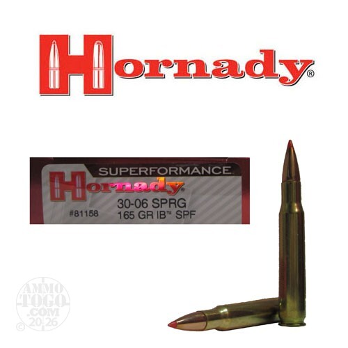 This is .30-06 Hornady Superformance 165gr. InterBond Ammo. Hornady InterBond bullets use a proprietary bonding process that holds the core and jacket together regardless of what the bullet encounters. The polymer point improves ballistic performance, accuracy and initiation of expansion. This ammo is manufactured by Hornady and is considered to be the best factory loaded ammo available. If you want the very best, Hornady is your answer. This ammo is brass cased, boxer primed, and 100% non-corrosive. Velocity 2960fps It comes packed in 20rd. boxes.