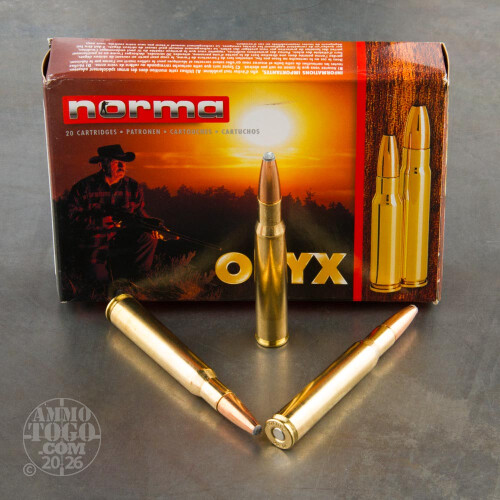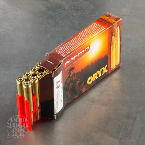This is .30-06 Norma Oryx 200gr. Bonded Soft Point Ammo. Norma Oryx ammo has a bonded all-around bullet that can withstand extreme deformation without separation of the jacket from the lead core. The specially designed forward portion of the jacket lets the Oryx bullet expand rapidly to more than twice its diameter. Even when heavy bone is hit, the bullet holds together and seldom loses more than 10% of its original weight. A large frontal surface makes for rapid energy delivery and the bullet’s minimal weight loss allows deep penetration and a broad, permanent wound channel that quickly downs the animal. This ammo comes packed in 20 round boxes.