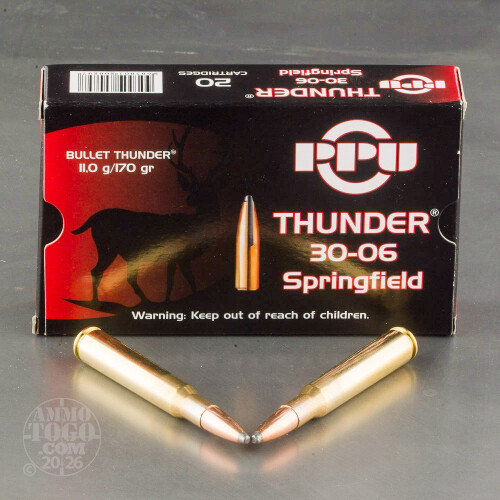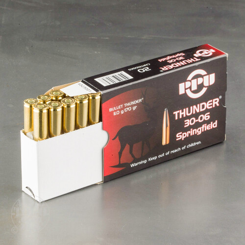 This package contains 20 rounds of Prvi Partizan Bullet Thunder .30-06 Springfield ammunition. Each new production cartridge is loaded with a 170 grain jacketed soft point projectile, These bullets are specially designed to deliver devastating energy transfer, massive expansion, and controlled penetration for quick and humane kills.