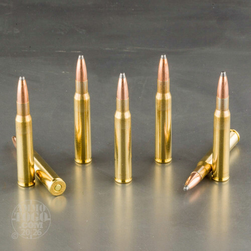 Each round features a boxer-primed brass casing and non-corrosive propellants. Leaving the muzzle at a velocity of 2430 feet per second, these rounds deliver 2665 foot pounds of muzzle energy.