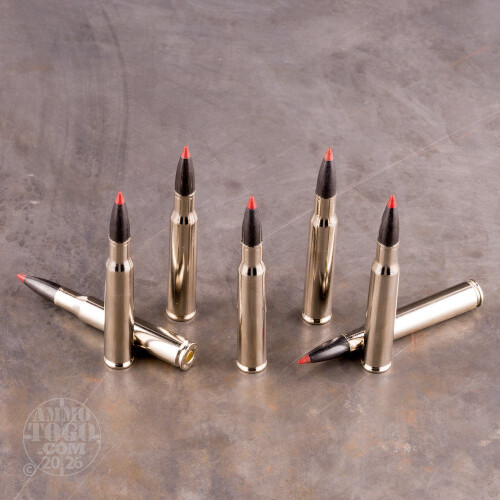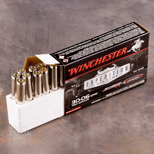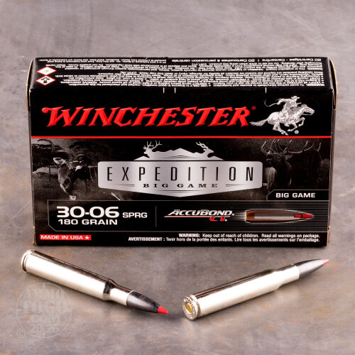 This is .30-06 Winchester Supreme 180gr AccuBond Bonded Ammo. Delayed, controlled expansion. Deep penetration through thick, tough skin, heavy muscle tissue and bone, high retained weight. Polymer Tip, Bonded Alloyed Lead Core, Lubalox (Black Oxide) Coating, Controlled Expansion. This ammo is nickel plated brass cased, boxer primed, non-magnetic and 100% non-corrosive. This ammo is packed in 20rd. boxes.