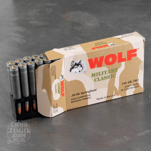 This is 30-06 Wolf Performance Ammunition Military Classic 145gr. Full Metal Jacket Ammo. This ammo has a polymer steel case and is 100% non-corrosive, berdan primed. Economically priced ammunition for high volume shooting. Designed for reliable ignition and functioning in adverse conditions. Polymer coating ensures smooth feeding and extraction. This ammo is packed in 20rd. boxes, 500rds. per case.