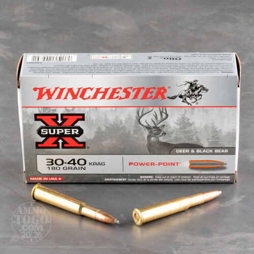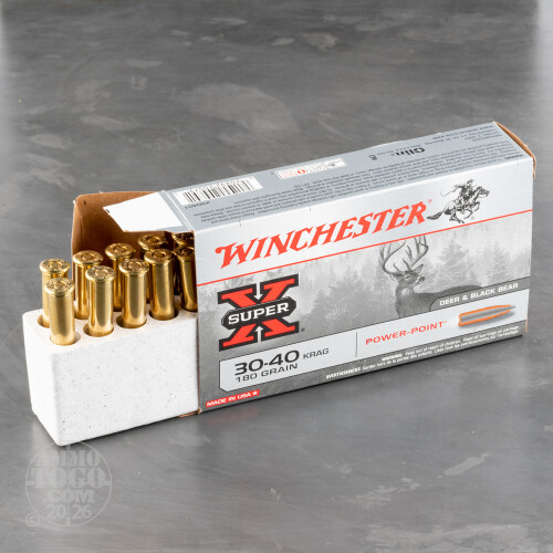 This is 30-40 KRAG Winchester 180gr. Power Point Soft Point Ammo.Unique soft nose jacketed design delivers maximum energy on target. Notches around jacket mouth improve upset and ensure uniform, rapid expansion. This ammo has a ballistic coefficient of .394 and a muzzle velocity of 2430 ft/sec. This ammo comes packed in 20rds. per box.