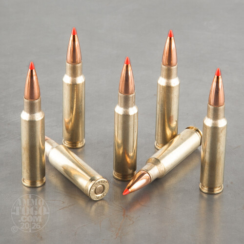 This 30 Thompson Center cartridge is made by Hornady, the same manufacturer which developed its caliber and first offered it for sale. As a Superperformance round you can look to this cartridge to provide up to 200 additional fps from your rifle, but without creating unwanted extra recoil, fouling, or loss of accuracy.This round is crowned with a 165 grain SST projectile, a bullet which delivers tremendous shock on impact made even more potent by its ensuing wide expansion. This is an accurate bullet with a secant ogive profile, boat tail design’s tapered base, and perfectly symmetrical polymer tip. Said tip creates lightning fast expansion as it enters its target, and the SST’s deep penetration is guaranteed by its synergetic InterLock ring and mid-body cannelure that together fight against core/jacket separation.