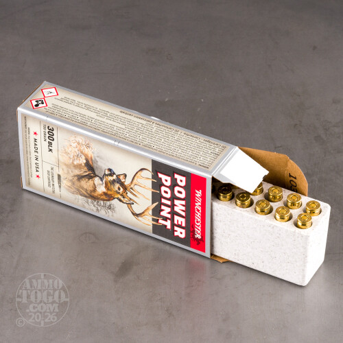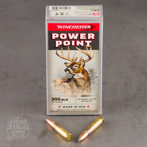 Some people will tell you the 300 AAC Blackout is not a good hunting cartridge. We believe those folks mean well. They’re just … unenlightened. If you want to show them the way, all you’ve got to do is order a few boxes of this ammo by Winchester and start knocking down deer like bowling pins!This round’s 150 grain soft point bullet is just as effective at plastering varmints, however, because it is Wincester’s ever popular Power-Point. Were you to saw a Power-Point in half you would be able to admire its impressive jacket concentricity, which makes certain the bullet remains stable and accurate even over longer distances. Examine the Power-Point head-on and you will see its skived jacket. It’s pre-programmed to open up uniformly while its soft lead core deforms, which creates the wide expansion that inflicts a fast and clean kill.