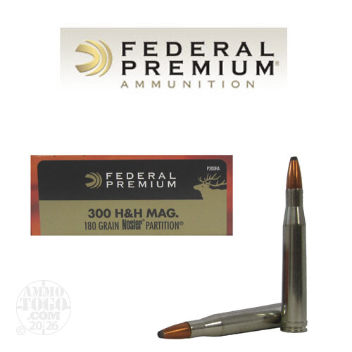 This is 300 H&H Mag. Federal Vital-Shok 180gr. Nosler Partition Ammo. Designed for maximum effectiveness on bigger animals with thick skin, heavy muscle tissue adn bone such as elk, moose, and brown bear. It's nickel-plated for corrosion resistance and a sleek look. You spend all year dreaming of the moment of truth - why trust it to anything less than the best. This ammo is nickel coated brass cased, boxer primed, non-corrosive and non-magnetic. It comes packed in 20rd. boxes. Velocity 2880 FPS.