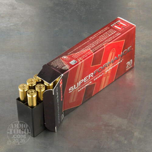 Non-corrosive, boxer primed, and brass cased, each high-performance round delivers an impressive muzzle velocity of 3310 feet per second with a 3648 foot pounds of game-dropping energy.