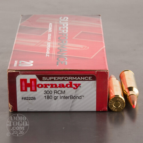 This is 300 RCM Hornady Superformance 180gr. InterBond Ammo. Hornady InterBond bullets use a proprietary bonding process that holds the core and jacket together regardless of what the bullet encounters. The polymer point improves ballistic performance, accuracy and initiation of expansion. This ammo is manufactured by Hornady and is considered to be the best factory loaded ammo available. If you want the very best, Hornady is your answer. This ammo is brass cased, boxer primed, and 100% non-corrosive. Velocity 3040 fps. It comes packed in 20rd. boxes.