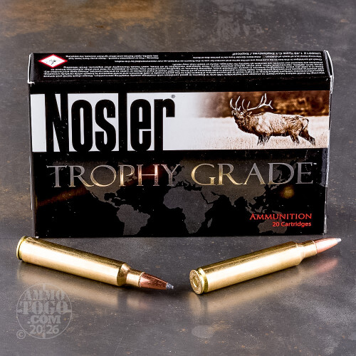 Leaving the muzzle at a velocity of 3350 feet per second, each round generates a muzzle energy of 4110 foot pounds. This ammunition is non-corrosive, boxer primed, and passes Nosler’s unsurpassed quality control standards. Use these rounds for hunting big game like whitetails, pronghorn, mule deer, and elk. Each package contains 20 rounds.