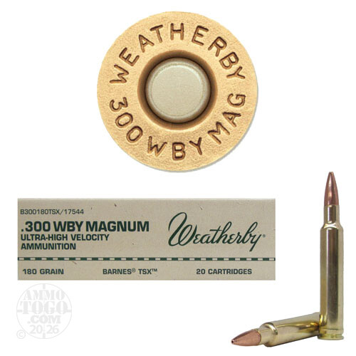 This is .300 Weatherby Magnum 180gr. Barnes TSX Hollow Point Ammo. The .300 Weatherby Magnum had the flattest trajectory, longest range and the greatest killing power of any .300 magnum on the market until the .30-378 Weatherby Magnum came along. Based on the .300 H&H Magnum, the .300 Weatherby delivers 300 more fps than its British cousin. Introduced in 1944, this is the all-around cartridge for the big game hunter. This X bullet is an all copper hollow point. Weatherby uses only the finest components, such as Norma brass, to assure that each load is as precise as a shooter's favorite handload. Premium ammunition for premium performance. This ammunition is new production, non-corrosive, in boxer primed, reloadable brass cases. This ammo comes packed in 20 round boxes.