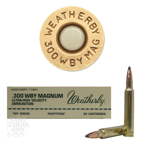 This is .300 Weatherby Magnum 180gr. Nosler Partition Ammo. The .300 Weatherby Magnum had the flattest trajectory, longest range and the greatest killing power of any .300 magnum on the market until the .30-378 Weatherby Magnum came along. Based on the .300 H&H Magnum, the .300 Weatherby delivers 300 more fps than its British cousin. Introduced in 1944, this is the all-around cartridge for the big game hunter. Weatherby uses only the finest components, such as Norma brass, to assure that each load is as precise as a shooter's favorite handload. Premium ammunition for premium performance. This ammunition is new production, non-corrosive, in boxer primed, reloadable brass cases. This ammo comes packed in 20 round boxes.