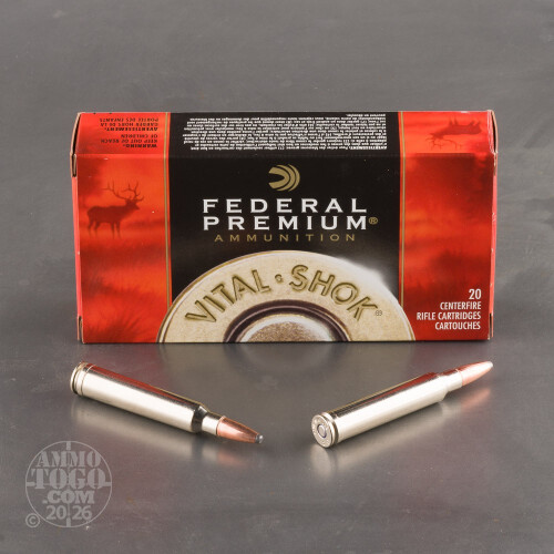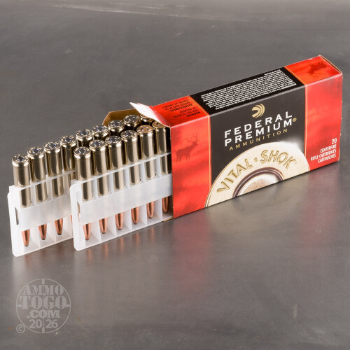 Leaving the muzzle at a velocity of 3502 feet per second, each round generates 2960 foot pounds of muzzle energy. This ammunition is 100 percent non-corrosive, boxer primed, and features reloadable brass cases. Each package contains 20 rounds of affordable Federal Vital-Shok .300 Win Mag ammunition.